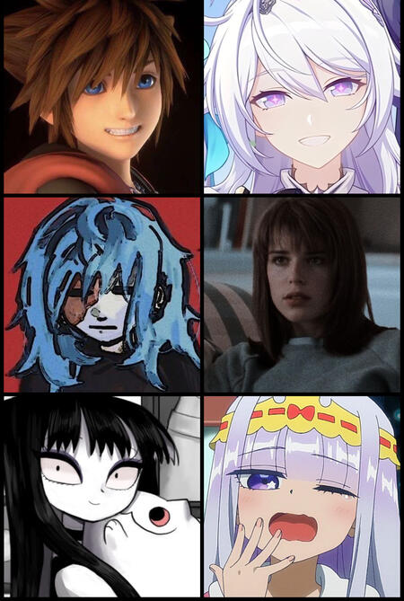 | sora, kiana kaslana, sal fisher, sidney prescott, flora cloud, & princess syalis |